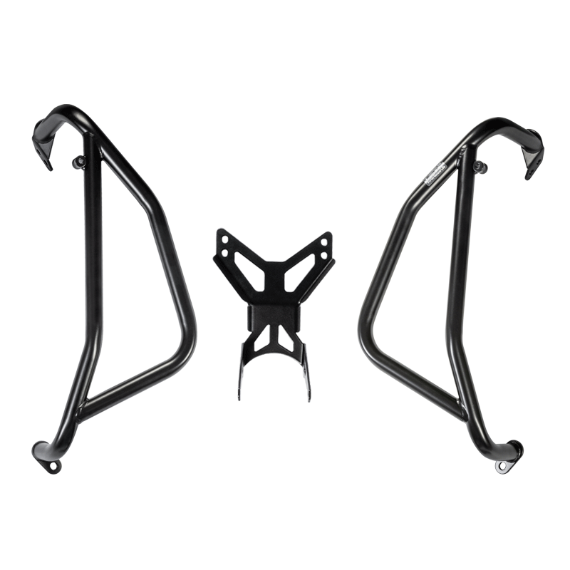 Die unteren Balken sind in hochfester Stahl um Stöße und Reibung zu absorbieren, während der Paramotor verwendet Aluminiumlegierung mit Dicke 4 mm um den unteren Teil des Motors zu schützen, ohne das Motorrad zu beschweren. Die Architektur mit erweiterte Ankerpunkte verbessert die Lastverteilung bei Stößen und längeren Stützen.1