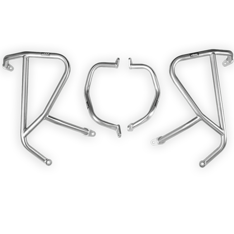 Precision-bent stainless steel tubes with dedicated brackets. The geometry hugs the front, ensuring protection and compatibility with skid plates and typical touring accessories.