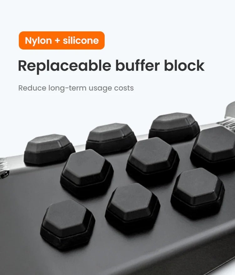 - Dual damping – rubber pads in the holes + silicone/nylon blocks to absorb shocks