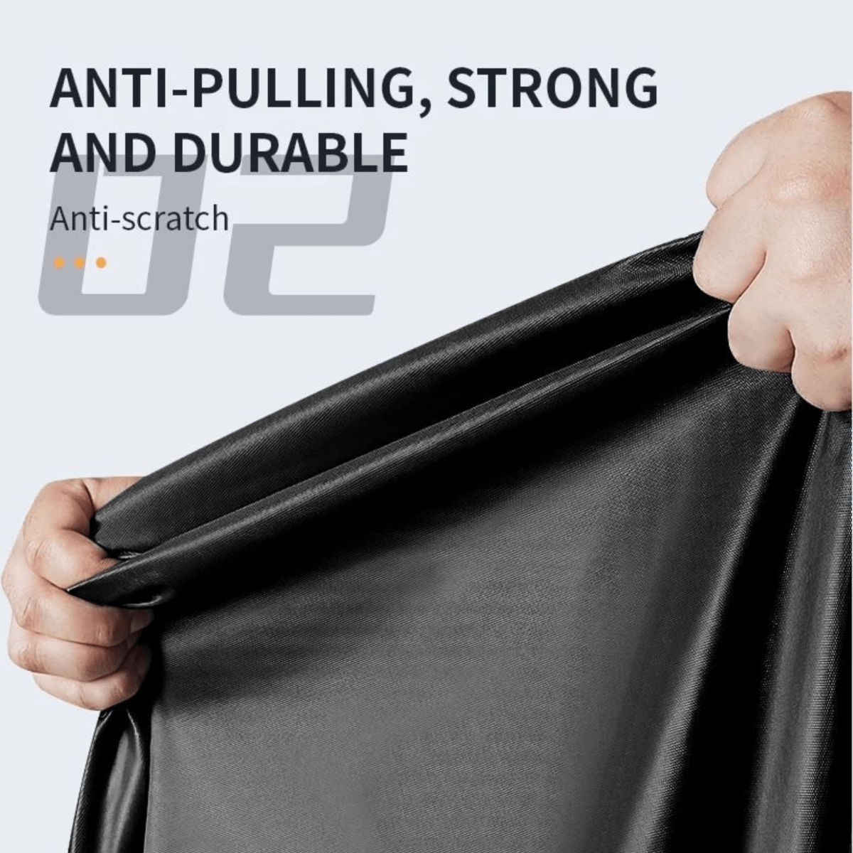 Tessuto Oxford 210D con trattamento idrorepellente e protezione UV. Le finiture sono pensate per un uso quotidiano: bordo elasticizzato per avvolgere ruote e cerchi, cinghia antivento per fissaggio centrale e foro antifurto per utilizzare un lucchetto (caratteristiche disponibili a seconda della variante).